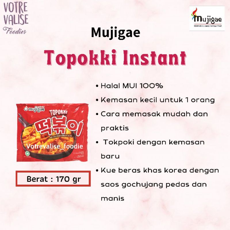 Harga Murah di Lapak Ready Stock RS Store. Mujigae Spicy Ramen Tteokpokki adalah produk ramen dan topokki instan dari Mujigae yang dibuat menggunakan bahan baku pilihan dengan rasa yang enak. Cara membuat topokki di rumah plus rekomendasi merek tteokbokki instan.
