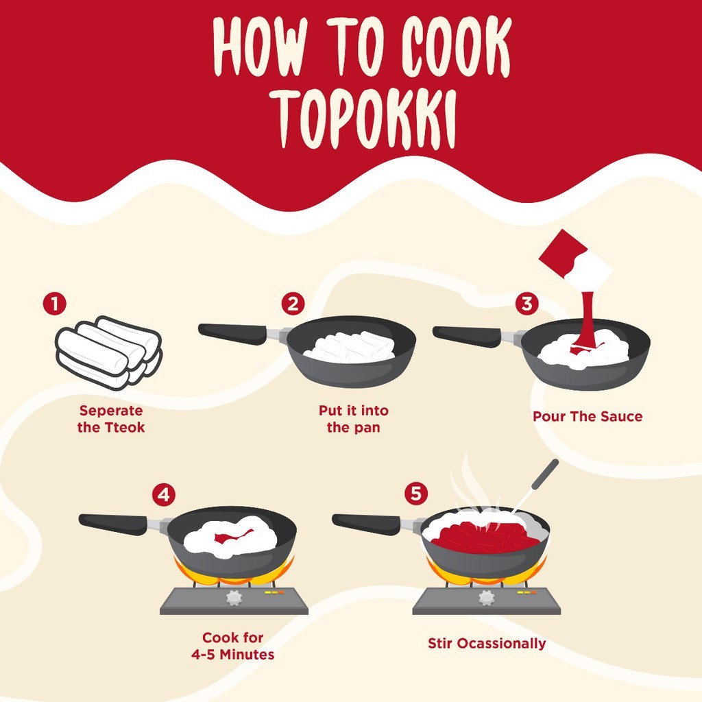 Cara masak topokki mujigae. Nyalakan kompor dalam api sedang h. Masukan topokki ke dalam wajan e. Buka kemasan saus kemudian tuang diatas topokki f.